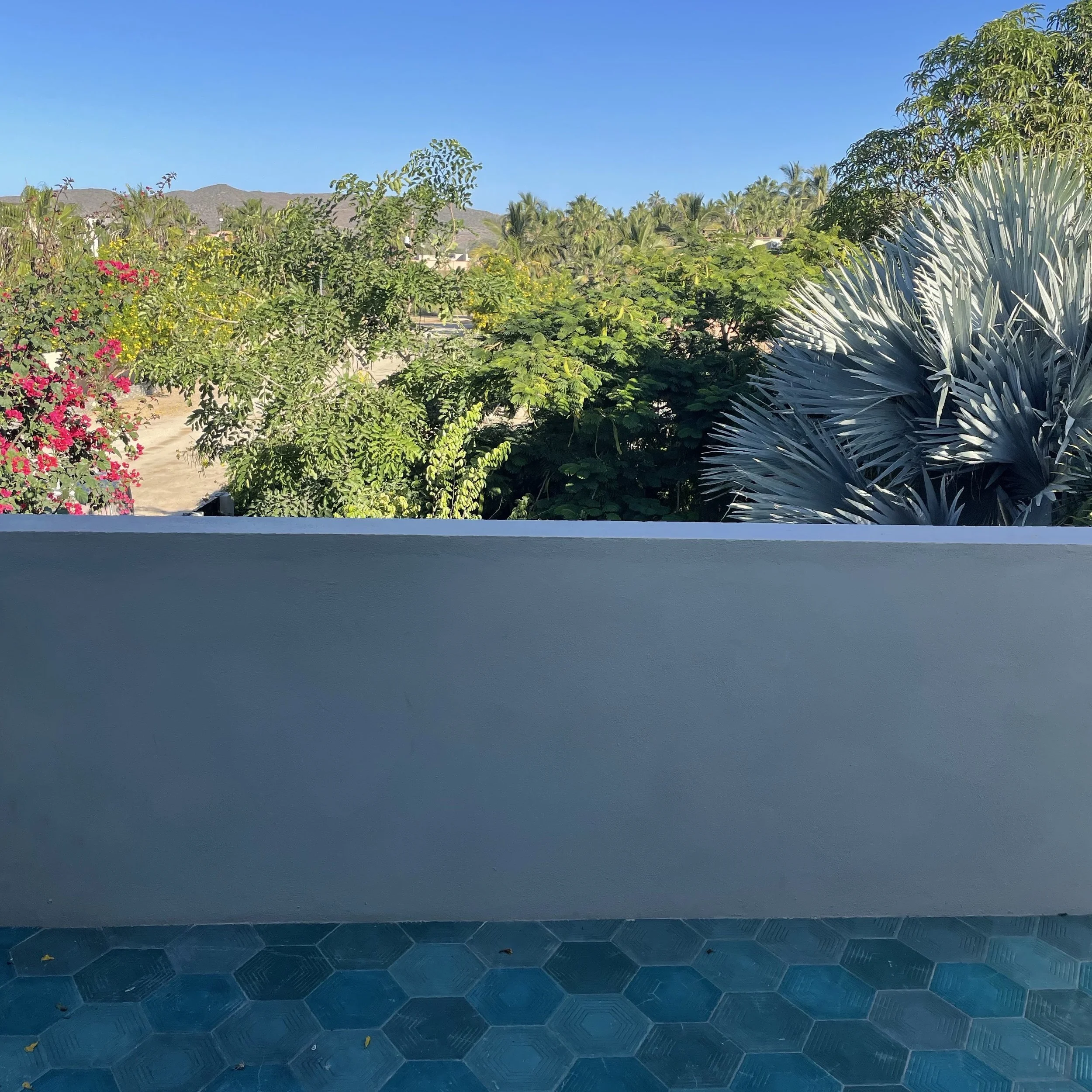 Head up the wave stairs, featuring tiles designed by owner Julie and made by local artisans in Todos Santos. Upstairs, the guest house features one large bedroom with two queen beds, a full bathroom, washer-dryer and plenty of built-in storage. You’ll enjoy taking in the the treetop and peek-a-boo ocean views from the window seat. Upstairs offers a patio with views of the lane and surrounding area.